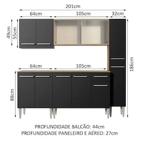 Medidas totais: 186 cm de altura x 201 cm de largura x 44 cm profundidade nos balcões e 27 cm nos aéreos e no paneleiro.