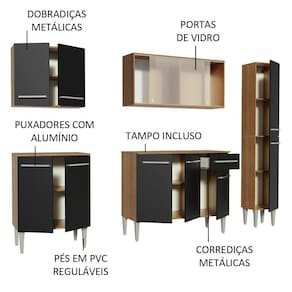 Itens inclusos: - Um (1) Armário Aéreo com duas (2) portas - Um (1) Balcão com duas (2) portas e tampo - Um (1) Armário Aéreo com duas (2) portas de correr de vidro - Um (1) Balcão com três (3) portas, uma (1) gaveta e tampo - Um (1) Paneleiro com duas (2) portas
