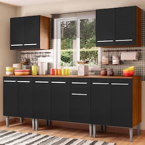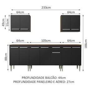 Medidas totais: 186 cm de altura x 233 cm de largura x 44 cm profundidade nos balcões e 27 cm nos aéreos.