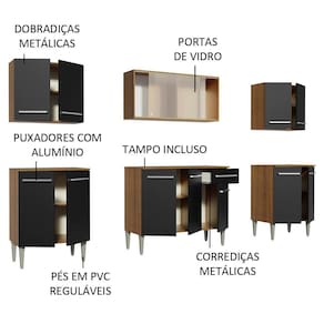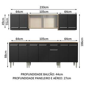 Medidas totais: 186 cm de altura x 233 cm de largura x 44 cm profundidade nos balcões e 27 cm nos aéreos.