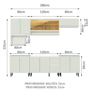 Medidas totais da cozinha: 280 cm de largura e 225 cm de altura. Profundidade de 52 cm nos módulos inferiores e 31 cm nos aéreos.