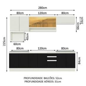 Medidas totais da cozinha: 280 cm de largura e 225 cm de altura. O balcão de pia comporta pias de 120 cm x 52 cm. Não acompanha tampo.