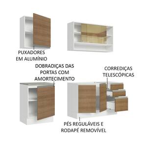 O acabamento da estrutura é branco e as portas e frentes são em amadeirado Rustic. Feito em Pintura Poliéster ecológica, com aplicação de 7 camadas de proteção resistentes a álcool, água e calor.