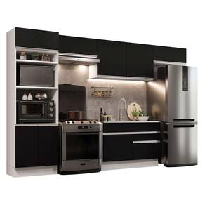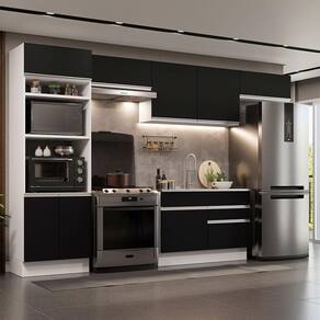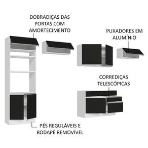 O acabamento da estrutura é branco e as portas e frentes são pretas. É feito em Pintura Poliéster ecológica com sete camadas, que destaca a tonalidade e protege o móvel.