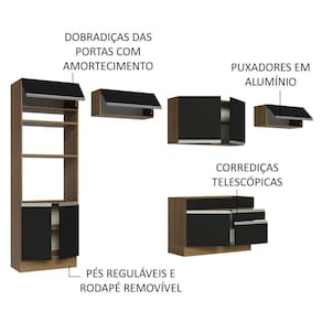 O acabamento da estrutura é no padrão amadeirado Rustic e as portas e frentes são pretas. Feito em Pintura Poliéster ecológica, com aplicação de 7 camadas de proteção resistentes a álcool, água e calor.