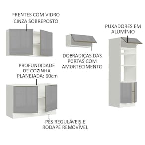 Um dos grandes destaques são as portas com vidro cinza sobreposto, muito bonito e elegante. Além disso, contam com revestimento metálico, amortecedores para o fechamento suave e puxadores em alumínio.