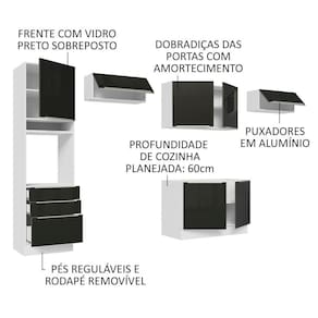 As gavetas possuem corrediças telescópicas e todas as portas contém amortecedor para o fechamento suave. Além disso, os puxadores são em alumínio, mais resistentes ao uso diário.
