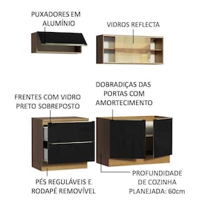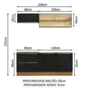 As medidas totais da cozinha são: 200 cm de largura x 225 cm de altura. A profundidade é de 60 cm nos módulos inferiores e 31 cm nos aéreos. O balcão de pia comporta pias de 120 cm x 60 cm. Não acompanha tampo.