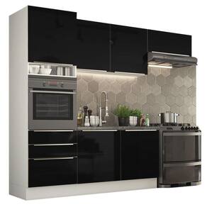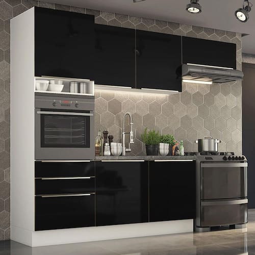 O acabamento da estrutura é branco e as portas e as frentes das gavetas são pretas. A Pintura em Poliéster Protetor consiste na aplicação de 7 camadas de proteção resistentes a álcool, água e calor.