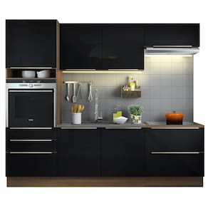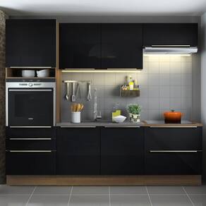 A linha de cozinhas Lux da Madesa é o que existe de mais sofisticado no mercado. O grande destaque são as portas e gavetas que recebem um vidro preto aplicado, detalhe que traz muita elegância ao ambiente.