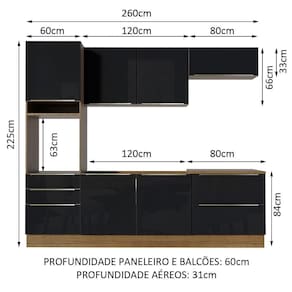 As medidas totais da cozinha são: 260 cm de largura x 225 cm de altura. A profundidade é de 60 cm nos módulos inferiores e 31 cm nos aéreos. O balcão maior comporta pias de 120 cm x 60 cm e não acompanha tampo.