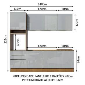 As medidas totais da cozinha são: 240 cm de largura x 225 cm de altura. A profundidade é de 60 cm nos módulos inferiores e 31 cm nos aéreos. O balcão comporta pias de 120 cm x 60 cm. Não acompanha tampo.