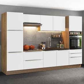 Este modelo conta com espaço de sobra para organizar todos os utensílios e louças da cozinha. Além disso, a torre possui espaço para colocação de forno normal ou embutido. O balcão de pia suporta pias de inox ou pedra no tamanho de 120 cm x 60 cm.