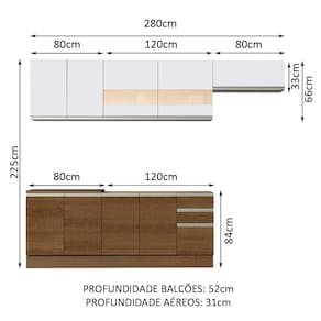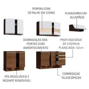 Outro grande diferencial desta cozinha é a profundidade maior, como uma cozinha planejada: 52 cm nos balcões inferiores e 31 cm nos aéreos. As medidas totais da Cozinha Madesa Marcela são: 280 cm de largura e 225 cm de altura.