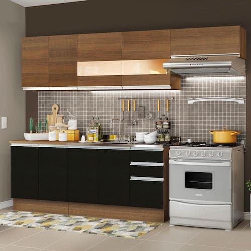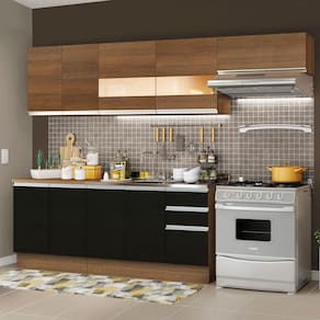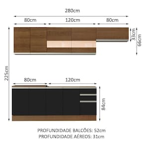 Outro grande diferencial desta cozinha é a profundidade maior, como uma cozinha planejada: 52 cm nos balcões inferiores e 31 cm nos aéreos. As medidas totais da Cozinha Madesa Marcela são: 280 cm de largura e 225 cm de altura.