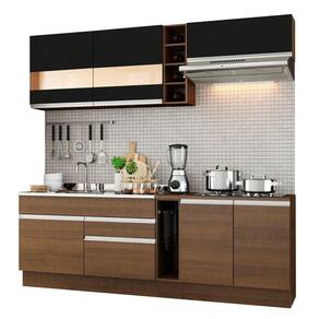 A profundidade é de cozinha planejada: 52 cm nos balcões e 31 cm nos aéreos. As medidas totais são: 220 cm de largura e 225 cm de altura.