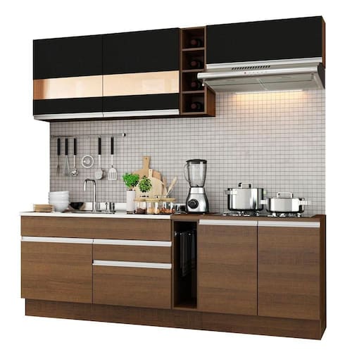 O acabamento da estrutura interna, externa, das portas dos balcões e das frentes das gavetas são no padrão amadeirado Rustic. As portas dos aéreos são pretas. As parte interna das gavetas e as costas são brancas. Os processos são feitos em Poliéster Protetor ecológico de alta resistência, que protege o móvel dos efeitos da água, do álcool e do calor.
