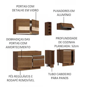 A profundidade é de cozinha planejada: 52 cm nos balcões e 31 cm nos aéreos. As medidas totais são: 220 cm de largura e 225 cm de altura.