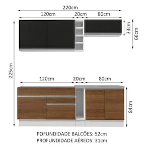 A profundidade é de cozinha planejada: 52 cm nos balcões e 31 cm nos aéreos. As medidas totais são: 220 cm de largura e 225 cm de altura.