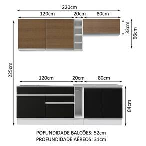 A profundidade é de cozinha planejada: 52 cm nos balcões e 31 cm nos aéreos. As medidas totais são: 220 cm de largura e 225 cm de altura.
