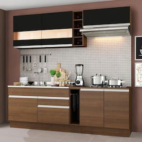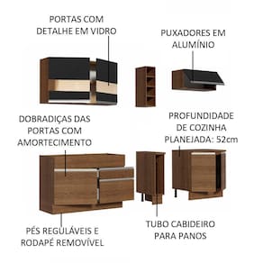 Itens inclusos: - Um (1) Balcão de Pia com duas (2) gavetas e uma (1) porta (Não acompanha tampo deste balcão) - Um (1) Porta-Panos com tampo em MDP - Um (1) Balcão com duas (2) portas e tampo em MDP - Um (1) Armário Aéreo com duas (2) portas com detalhe em vidro reflex - Um (1) Armário Aéreo com uma (1) porta basculante - Uma (1) Adega