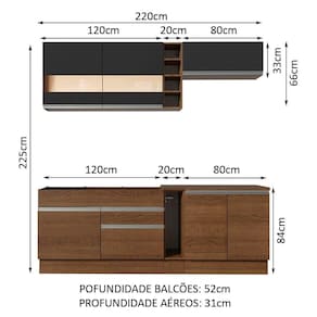 A profundidade é de cozinha planejada: 52 cm nos balcões e 31 cm nos aéreos. As medidas totais são: 220 cm de largura e 225 cm de altura.