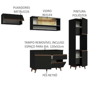Para completar, os módulos são avulsos, o que permite a montagem conforme a necessidade do ambiente. Além disso, o balcão acompanha tampo, que pode ser removido para colocação de pia com espaço de 120 x 52 cm.