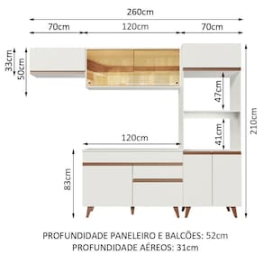 As medidas totais são: 260 cm de largura e 210 cm de altura. A profundidade é de cozinha planejada: 52 cm no balcão e na torre e 31 cm nos aéreos.