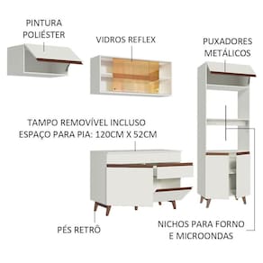 Para completar, os módulos são avulsos, o que permite a montagem conforme a necessidade do ambiente. Além disso, o balcão acompanha tampo, que pode ser removido para colocação de pia com espaço de 120 x 52 cm.