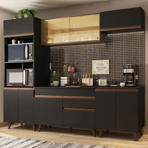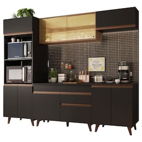 A cozinha é fabricada com materiais de padrão superior, como corrediças e dobradiças metálicas. Os puxadores são embutidos, em alumínio na coloração marrom. Os módulos avulsos permitem a montagem conforme a necessidade do ambiente e os pés em madeira são um charme a parte que além de beleza, conferem firmeza e resistência ao móvel.