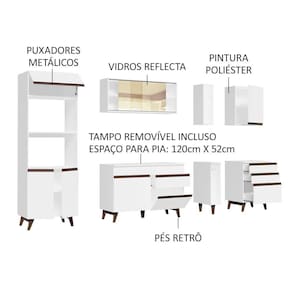 O acabamento da cozinha é branco, feito em Pintura Poliéster ecológica, que protege o móvel dos efeitos da água e do calor.