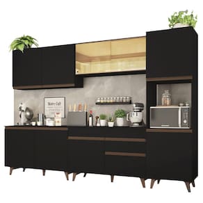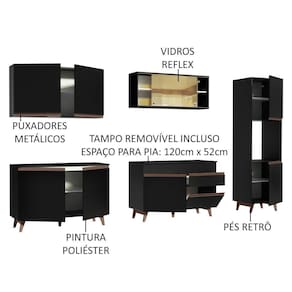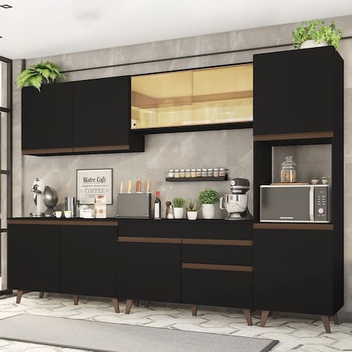O acabamento da cozinha é preto, com exceção das partes internas das gavetas e das costas, que são brancas. O processo é feito em Pintura Poliéster ecológica de alta resistência, que dá maior destaque à tonalidade e conserva a beleza do móvel por mais tempo.