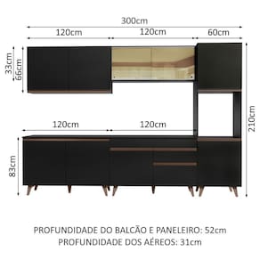 - 52 cm de profundidade nos balcões e no paneleiro e 31 cm nos aéreos