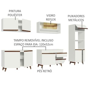 O acabamento da cozinha é branco, feito em Pintura Poliéster ecológica de alta resistência, que dá maior destaque à tonalidade e conserva o móvel por mais tempo.