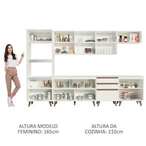 Projetada com base em tendências atuais de design, a linha de Cozinhas Reims da Madesa é fabricada com materiais nobres, como dobradiças metálicas e puxadores embutidos em alumínio na coloração marrom. Os pés em madeira conferem mais resistência e trazem sofisticação ao móvel.