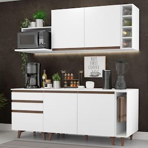 O espaço disponível é ideal para a organização de louça, panelas e utensílios. Além disso, todos os balcões acompanham tampos em MDP e o tampo do balcão maior pode ser removido para instalação de pia de inox ou pedra com espaço de 120 x 52 cm.