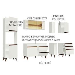 Todos os balcões acompanham tampo, sendo que o do balcão maior pode ser removido para colocação de pia de inox ou pedra com espaço de 120 x 52 cm. A torre permite a colocação de forno ou micro-ondas.