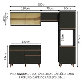- 52 cm de profundidade no balcão e no paneleiro e 31 cm nos aéreos