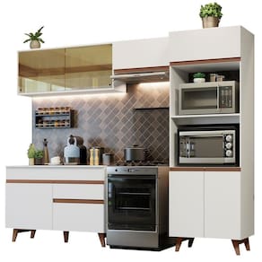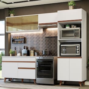 Totalmente modulada, possui muito espaço disponível, ideal para organizar utensílios, panelas, louças e o que mais você preferir. Além disso, a torre quente oferece espaço para a colocação de forno elétrico e micro-ondas.