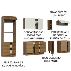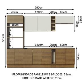 As medidas totais são: 290 cm de largura e 225 cm de altura. Profundidade de 52 cm nos balcões na torre e 31 cm nos aéreos.