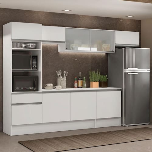 É fabricada com materiais de qualidade, como puxadores em perfil total de alumínio, dobradiças e corrediças metálicas. Além disso, os vidros no armário aéreo deixam sua cozinha muito mais elegante e sofisticada.