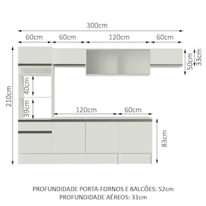 As medidas totais são: 300 cm de largura e 210 cm de altura; profundidades de 31 cm nos aéreos e 52 cm nos balcões e na torre.