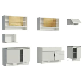 - Um (1) balcão de pia de 120 cm de largura com uma (1) porta e duas (2) gavetas, sendo uma maior. (Não acompanha o tampo deste balcão.)