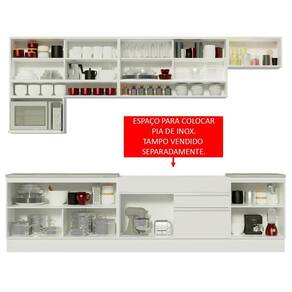 Medidas totais da cozinha: 300 cm de largura e 225 cm de altura. O balcão de pia comporta pias de 120 cm x 52 cm. Não acompanha tampo.