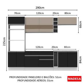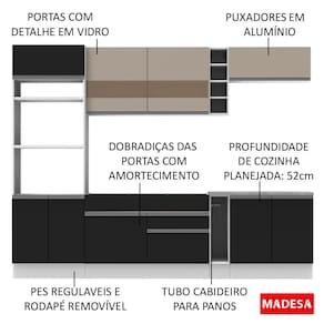 O balcão de pia comporta pias de 120 cm x 52 cm. Já o balcão para cooktop segue com tampo de 80 cm x 52 cm que pode ser recortado para a colocação do cooktop. Possui também pés reguláveis e rodapé removível. A torre possui espaço para forno e micro-ondas e permite a instalação de forno embutido. Para completar, com opção de aéreos em tom bronze com detalhe em vidro conferindo elegância ao ambiente.