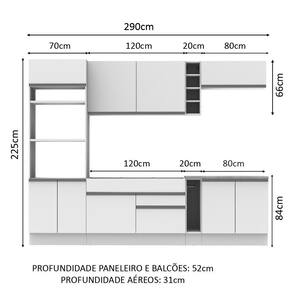 Outro grande diferencial desta cozinha é a profundidade maior, como uma cozinha planejada: 52 cm no balcão inferior e 31 cm nos aéreos. As medidas totais são: 290 cm de largura e 225 cm de altura.