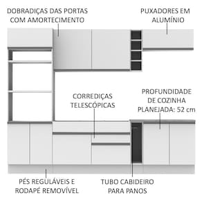As gavetas possuem corrediça telescópica e todas as portas possuem amortecedor para o fechamento suave. Esses itens de qualidade superior conferem durabilidade e maior vida útil do móvel.