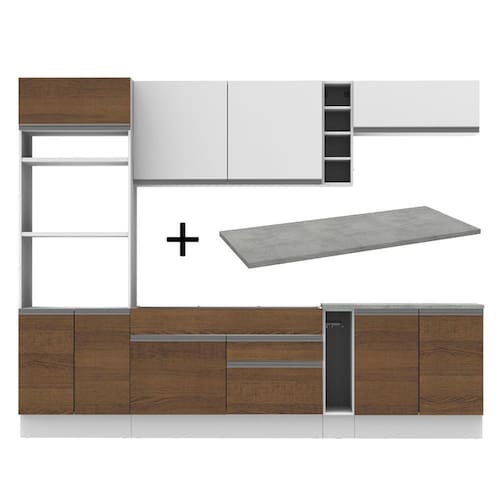 O balcão de pia comporta pias de 120 cm x 52 cm e acompanha tampo em pintura Mood. Já o balcão menor segue com tampo de 80 cm x 52 cm que pode ser recortado para a colocação do cooktop. A torre possui espaço para forno e micro-ondas e permite a instalação de forno embutido.