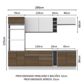 Outro grande diferencial desta cozinha é a profundidade maior, como uma cozinha planejada: 52 cm no balcão inferior e 31 cm nos aéreos. As medidas totais são: 290 cm de largura e 225 cm de altura.