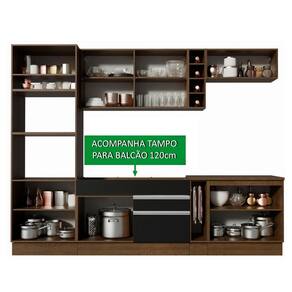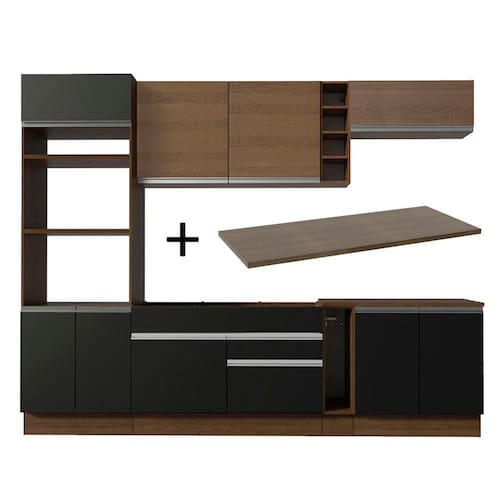 O acabamento da estrutura da cozinha e das portas dos aéreos são no padrão amadeirado Rustic. As portas da torre e do balcão e as frentes das gavetas são pretas. As partes internas das costas e das gavetas são brancas. O processo é feito em Poliéster Protetor ecológico de alta resistência, que protege o móvel dos efeitos da água, do álcool e do calor.